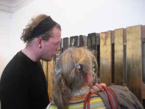 Artist Jan Franciscus de Gier discusses the Euro pallets he and partner Vigdis Haugtrø contributed to the show with a Nowegian artist attending the opening