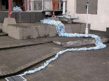 (Photo of “100% Pure,” an installation of a waterfall Conlon constructed from plastic water bottles)