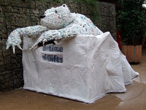 One of the fun things about going out of town and slacking off on the trash research for a bit is that when you finally get around to rooting around for what you missed, there’s quite a bit out there. Treat yourself to this excellent WebUrbanist post highlighting 7 trash artists. You’ll see some old favorites, like the miraculous silhouettes made from trash shadows to the world renowned trash people to street art made from trash. But there are some new (to me at least) discoveries in there as well: turkeys made from scrap metal and this lovely bear head made of woven plastic bags. If you ask me, there’s nothing sweeter than a plastic bag bear.