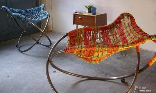 This is one of my favorite reuses of plastic bags ever: bike wheel framed rocking chairs from Mali!