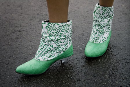 You may recall the same source led me to these hot fused plastic boots. It’s been an interesting year for upcycled footwear.