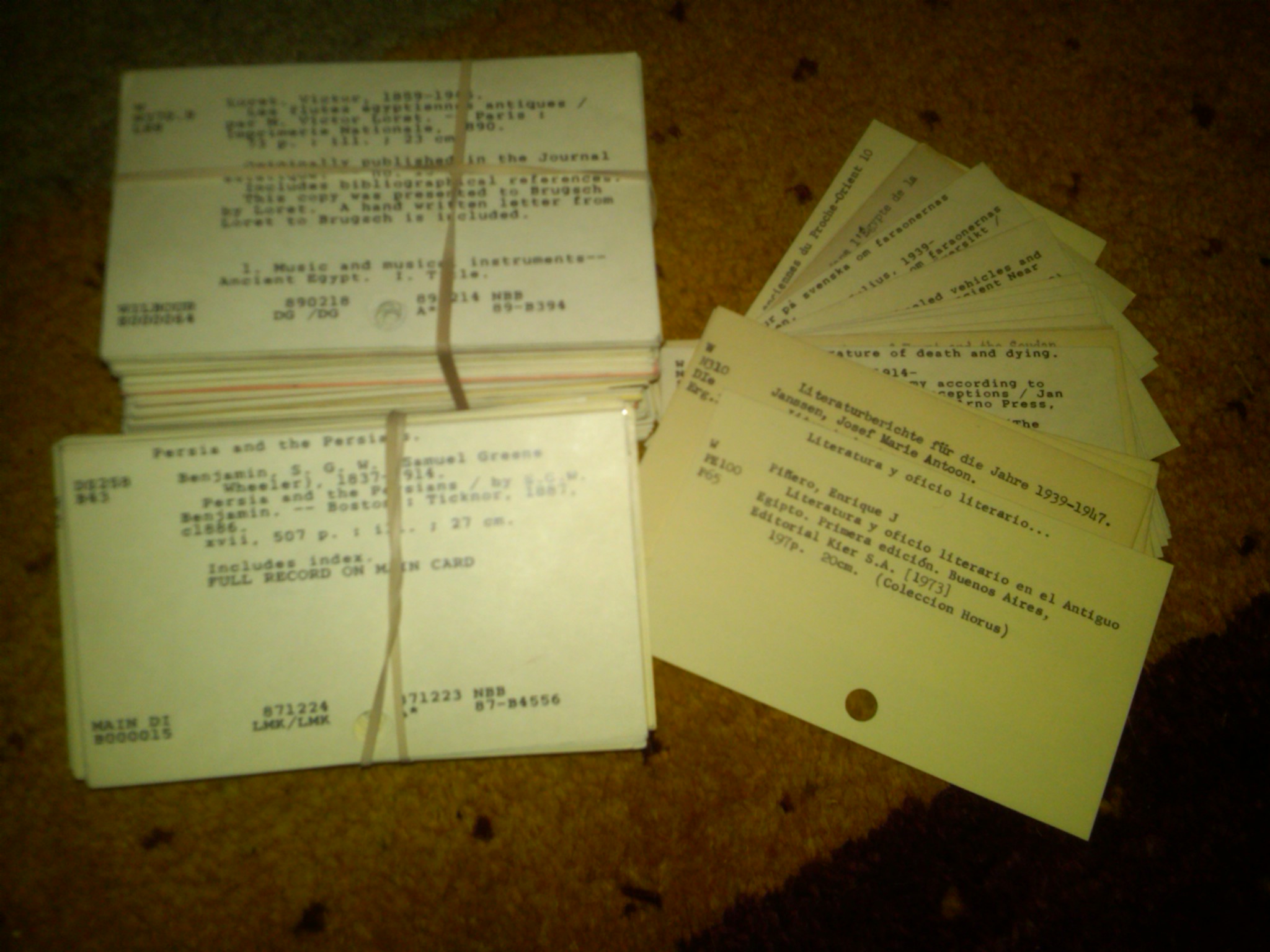 The library at the Brooklyn Museum switched over to an online book archiving system and thus have no more use for the cards in their old card catalog. So they’ve been giving them away to artists, art of the book design students and, more recently, anyone who let’s them know what they plan to do with the cards. I wrote in and requested a bunch and arranged an appointment to pick them up. Stay tuned for literary upcycling updates.