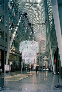 A 21-foot tall sculpture in the form of a chandelier made of recycled plastic containers will hang above the World Financial Center Winter Garden’s famed marble staircase for an entire month starting on April 15th.