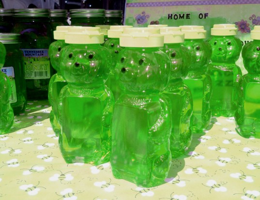 We posted about it here in 2012, along with links to a similar phenomenon in France where beekeepers documented blue and green honey later traced to M&M factory waste; and I even tasted some mildly affected honey during a tour of Eco Brooklyn’s show house.