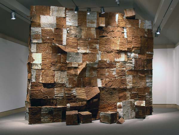 Ghanaian-born/Nigerian-dwelling artist El Anatsui uses all kinds of cool trash in his work: from would-be discarded casava graters to the caps used to top off local home brew, to milk tins and so on. Check out  the National Museum of African Art Web site for more images and to hear the artist himself describe his work, such as the Crumbling Wall pictured here.
